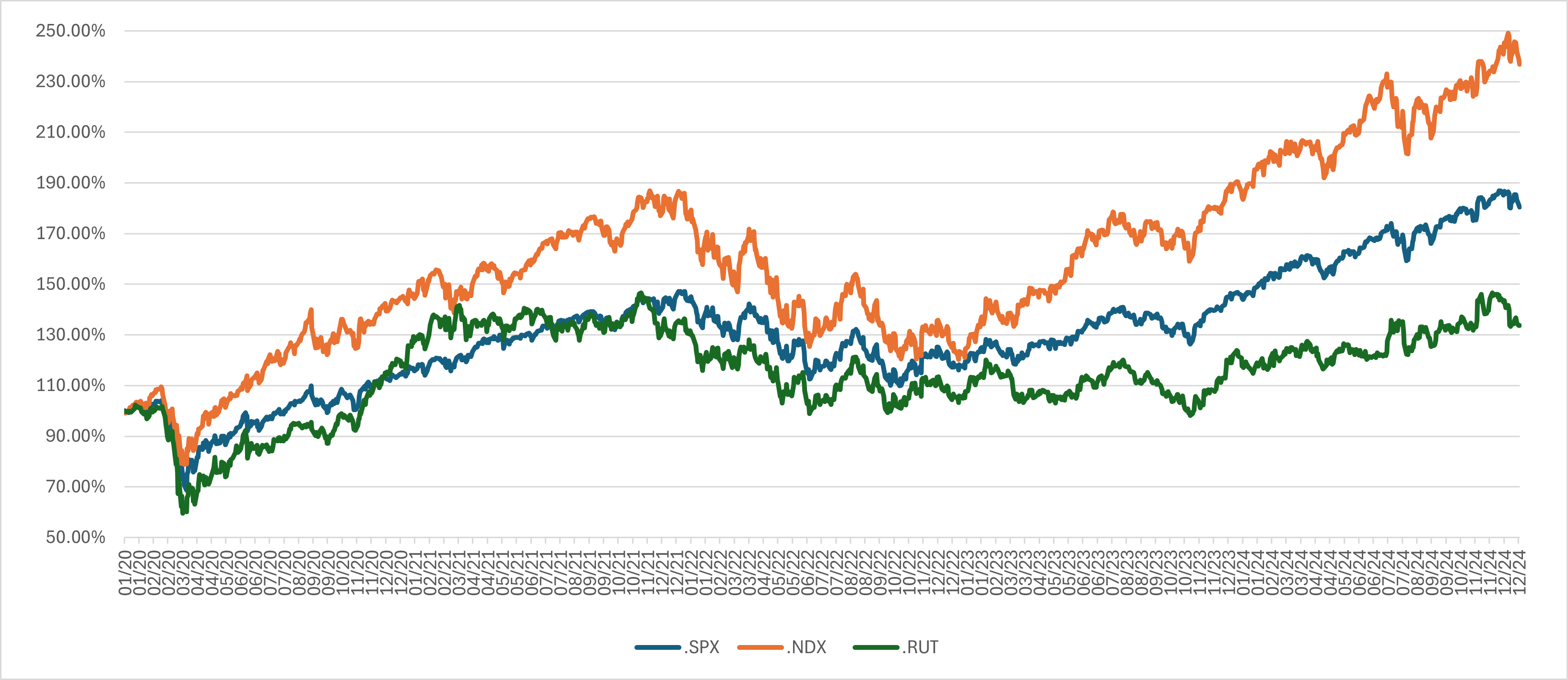 This diverse global dataset includes international markets as well as US indices (SPX, NDX and RUT) tested across different markets and regimes. From Figure 1, the US indices saw a significant divergence between the start of 2020 to the end of 2024. The Nasdaq rose to 237% of its initial value and the S&P 500 rose to 181%. By contrast, the Russell only grew to 134%, thus significantly underperforming the two other indices. This emphasises how strategies should be tested across several indices even within a single market.