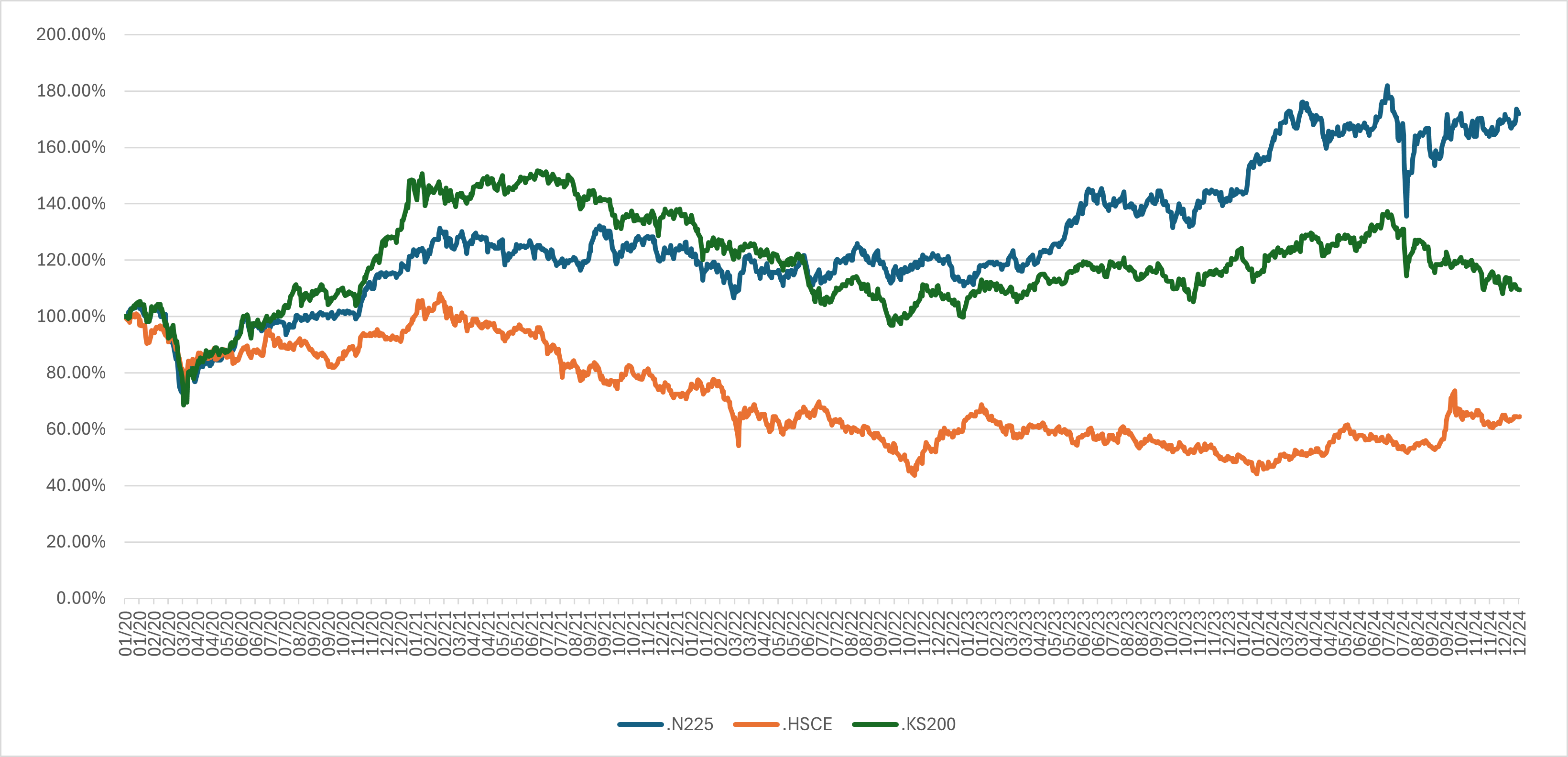 The Asian markets' rebased chart (Figure 2) shows marked regional differences driven by COVID-19 measures, regulatory pressures, and geopolitical tensions. During the COVID-19 outbreak in Asia, the Nikkei and Kospi reached their lowest levels in the backtesting period, at ~71% and ~68% respectively on 19 March 2020. Both indices subsequently recovered, with the Nikkei rising to ~182% by July 2024 and the Kospi to ~152% by June 2021. In contrast, the Hang Seng declined to roughly 44% in October 2022, reflecting the impact of strict pandemic policies. These differences illustrate the usefulness of testing global, since the environments of the US, Europe and Asia are quite different.