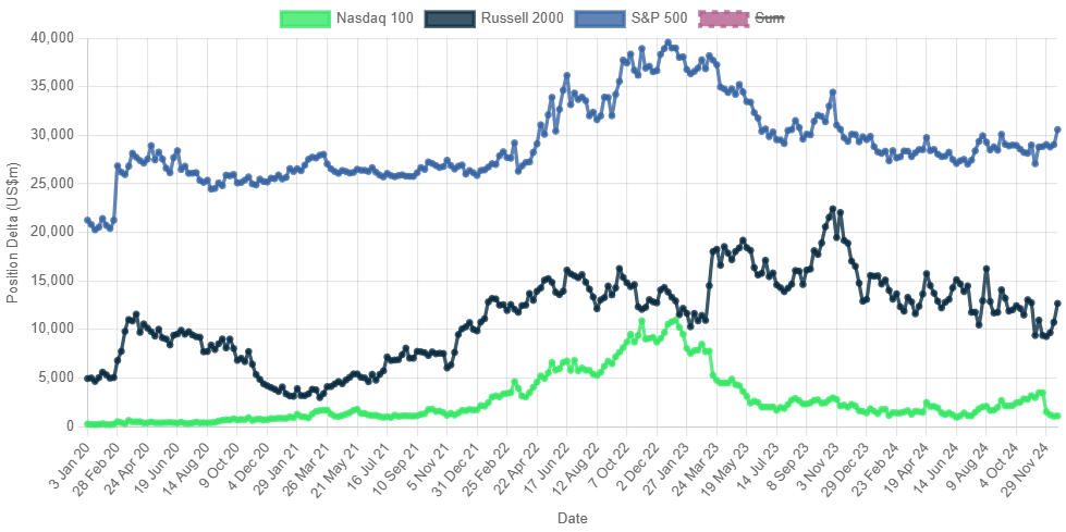 As part of this service, Greeks analysis is provided across three main US indices. Each index is quite different and this will affect structured product sensitivities. The S&P 500 comprises large-cap stocks and hence offers broad exposure and a balanced risk-return trade off. Since Nasdaq represents mostly technology companies, it gets affected by changes in outlook and rates, especially, thus forming uncommon volatility patterns. The Russell 2000 represents smaller companies which can react sharply to market stress.