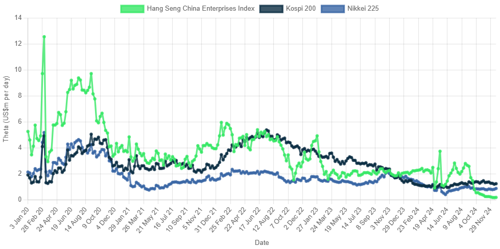 In Figure 5, Theta charts for Asian markets reveal some interesting risk profiles. Hang Seng showed the most volatility on the back of Chinese regulatory crackdowns and COVID-19 restrictions. The Kospi, meanwhile, with its export-oriented economy coupled with the choice of products in that market mean that the Theta exposure is steadier.