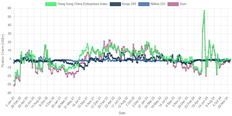 Position Charm (Figure 6) further draws out further interesting data. Charm is necessarily a very changeable quantity as it predicts changes in delta expected in the short term if there is no market movement. It will therefore be affected by maturities and autocalls. The charts emphasise the need for Asia-specific strategies that take export dependence, policy uncertainty and currency risk into account.