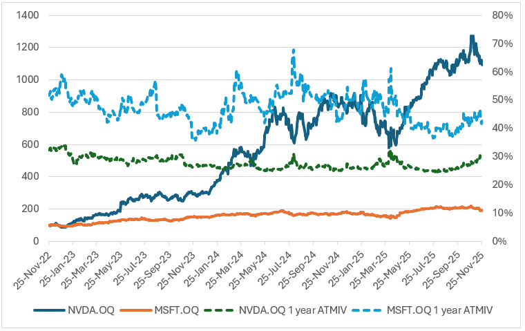 NVIDIA’s price performance over the past three years has been significantly stronger and more volatile, with upward trends accompanied by larger swings in daily and weekly returns. This behaviour is reflected in the higher implied volatility also shown in the chart, which has generally remained above Microsoft’s throughout the period.